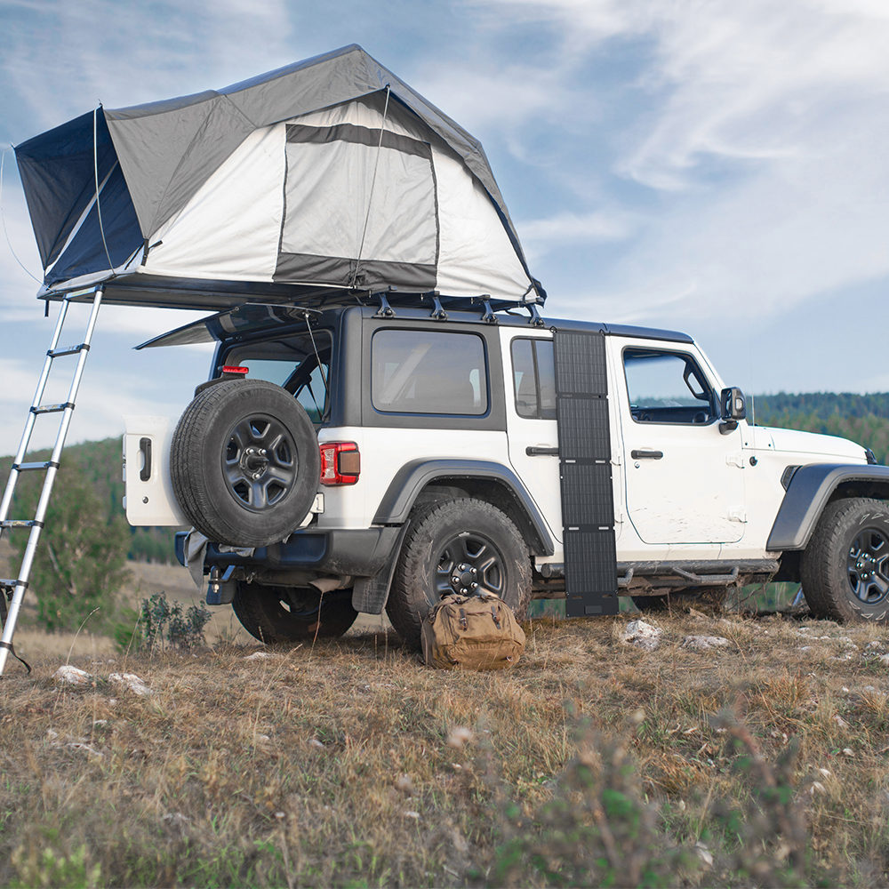 Dank seines ultrakompakten Designs lässt sich das Solarpanel problemlos transportieren. Die faltbare Vier-Panel-Konstruktion reduziert die Grösse auf das Format eines Laptops, sodass es mühelos in einem Rucksack oder Kofferraum verstaut werden kann. Damit ist es der ideale Begleiter für Reisen, Camping oder Expeditionen.