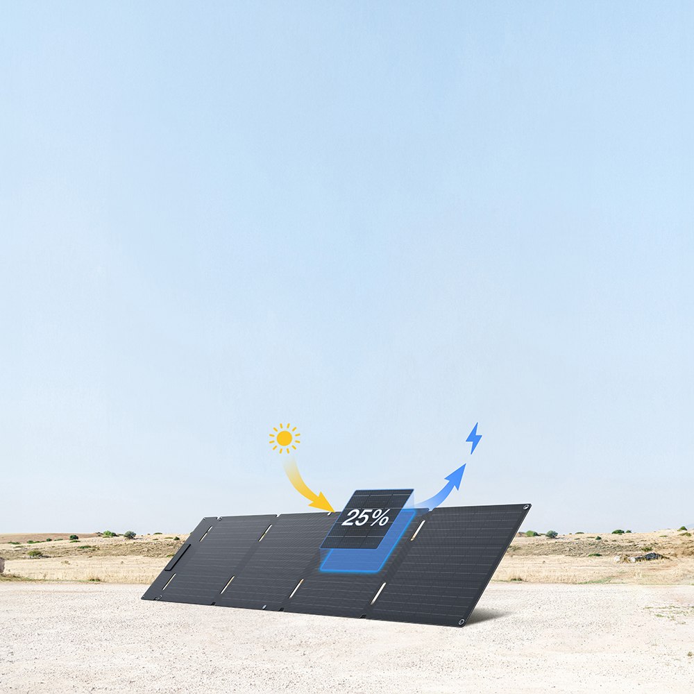 Das 60W Solarpanel nutzt die neueste TOPCon-Solartechnologie, um eine besonders hohe Energieeffizienz zu erreichen. Mit einer Umwandlungsrate von bis zu 25 % wird die Sonnenenergie optimal genutzt, sodass beispielsweise ein RIVER 3 Powerstation bei direkter Sonneneinstrahlung in nur 4.7 Stunden vollständig aufgeladen werden kann. Dadurch eignet sich das Panel perfekt für längere Outdoor-Abenteuer, Camping oder autarke Energieversorgung.