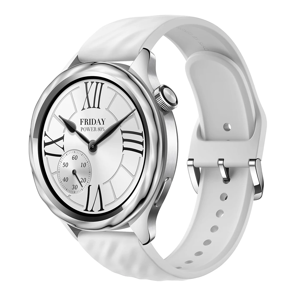 Die Lünette aus Edelstahl in der Farbe Flüssigsilber verleiht der Smartwatch einen modernen und edlen Look. Ergänzt wird das Design durch ein hochwertiges Fluororubber-Armband, das nicht nur besonders strapazierfähig und langlebig ist, sondern auch maximalen Tragekomfort bietet – ideal für sportliche Aktivitäten und den Alltag.