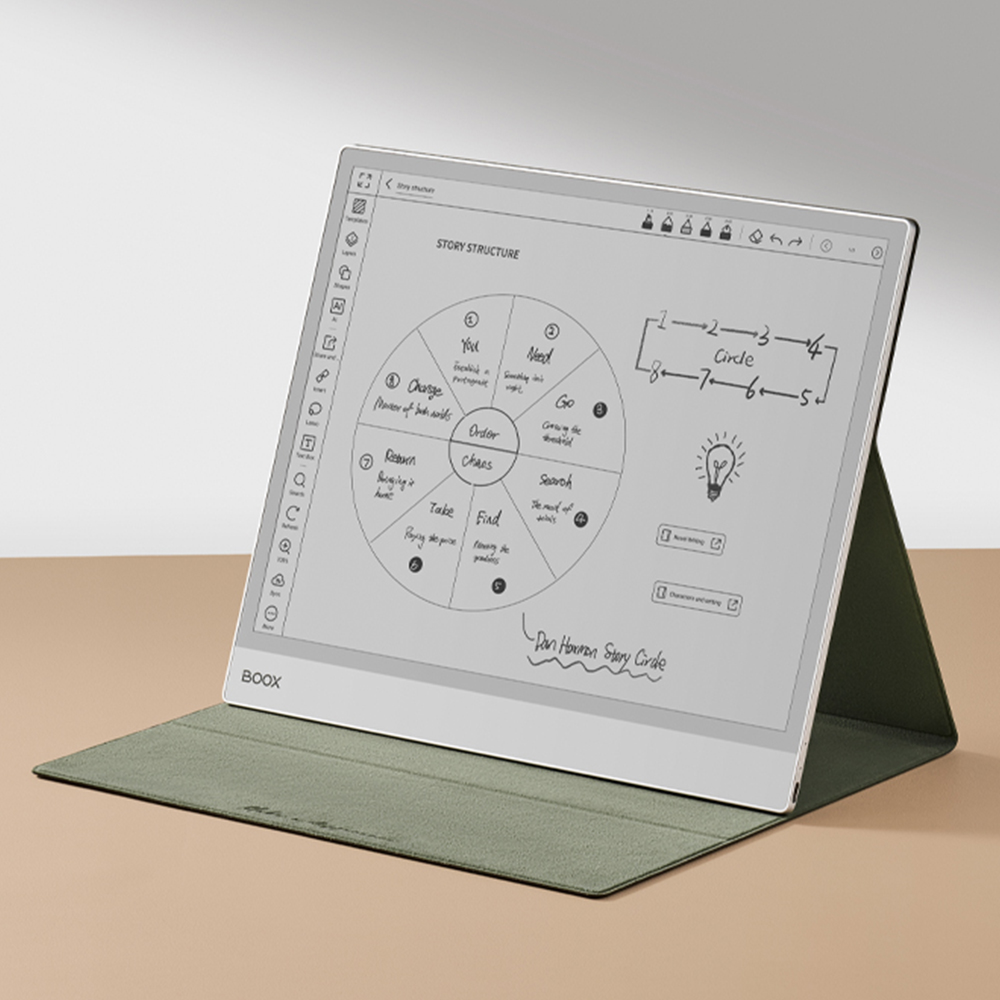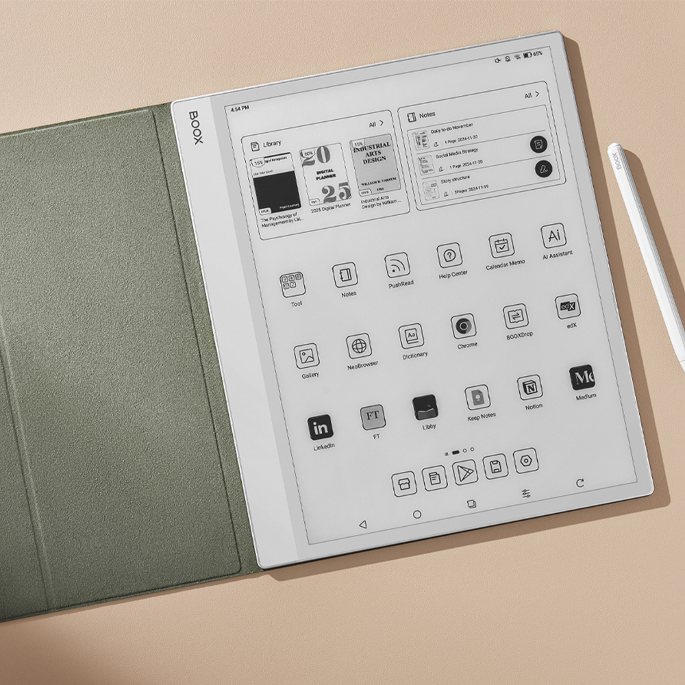 Die Hülle wurde mit einem faltbaren Standfuss ausgestattet, der verschiedene Betrachtungswinkel ermöglicht und das Lesen oder Präsentieren erleichtert. Die automatische Sleep/Wake-Funktion aktiviert oder deaktiviert das Gerät beim Öffnen und Schliessen der Hülle und hilft so, die Akkulaufzeit zu optimieren. Durch das schlanke und leichte Design bleibt der BOOX Note Max stets handlich und komfortabel nutzbar.