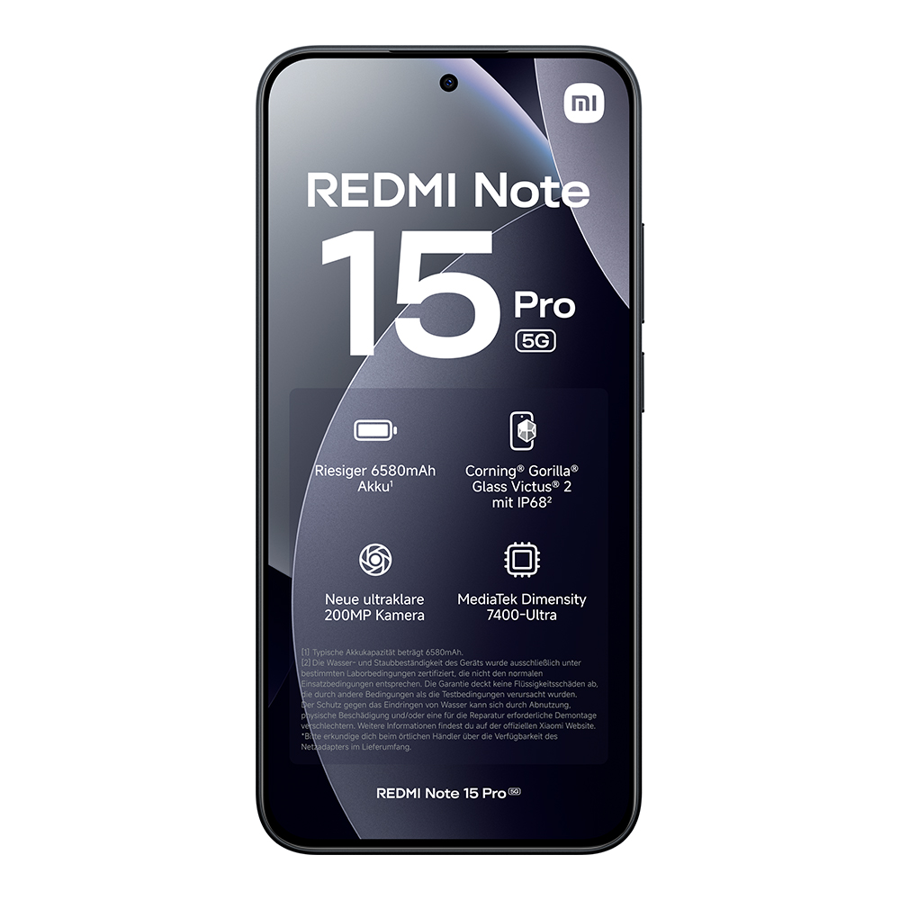 | Lieferumfang: | 1x Redmi Note 15 Pro 5G, 1x USB-C-Kabel, 1x SIM-Auswurftool, 1x Schutzhülle, 1x Kurzanleitung |