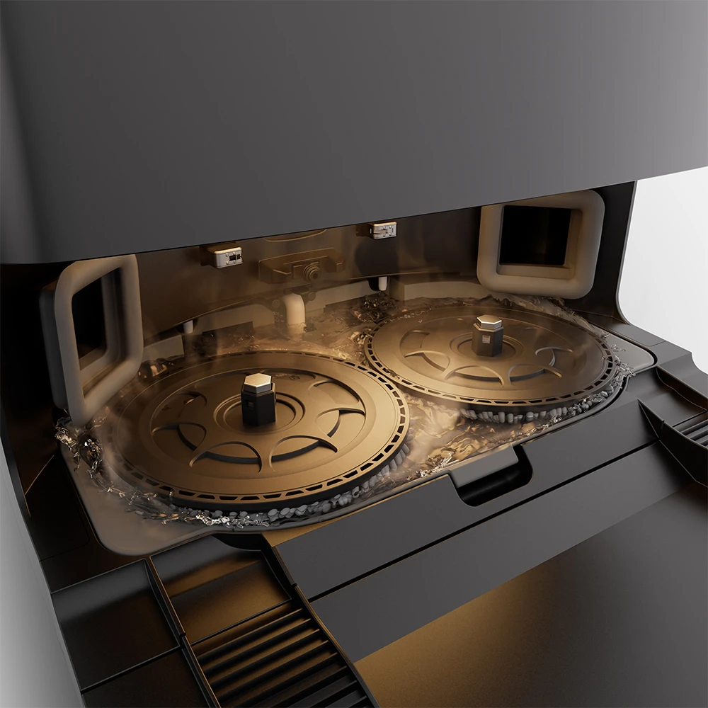 Das FlexiArm-Design passt sich automatisch an Raumstrukturen wie Ecken und Möbelkanten an und erreicht fast vollständige Kantenabdeckung. Zwei rotierende Mop-Pads arbeiten mit bis zu 200 Umdrehungen pro Minute und einer Hubbewegung von bis zu 10 mm. Der Wasserfluss lässt sich in 30 Stufen variieren, wodurch sich die Feuchtigkeitsabgabe präzise auf den Bodenbelag abstimmen lässt.