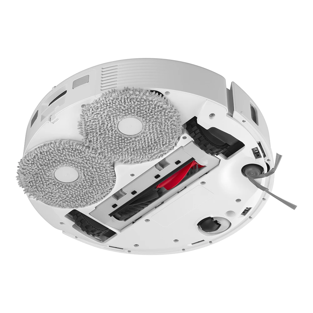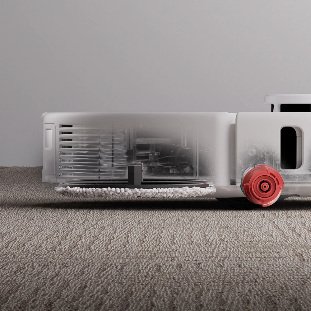Das FlexiArm-Design passt sich automatisch an Raumstrukturen wie Ecken und Möbelkanten an und erreicht fast vollständige Kantenabdeckung. Zwei rotierende Mop-Pads arbeiten mit bis zu 200 Umdrehungen pro Minute und einer Hubbewegung von bis zu 10 mm. Der Wasserfluss lässt sich in 30 Stufen variieren, wodurch sich die Feuchtigkeitsabgabe präzise auf den Bodenbelag abstimmen lässt.