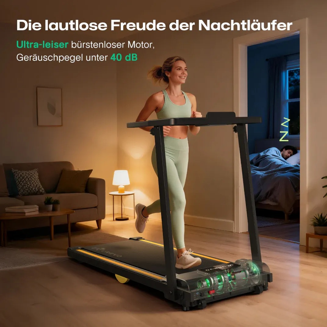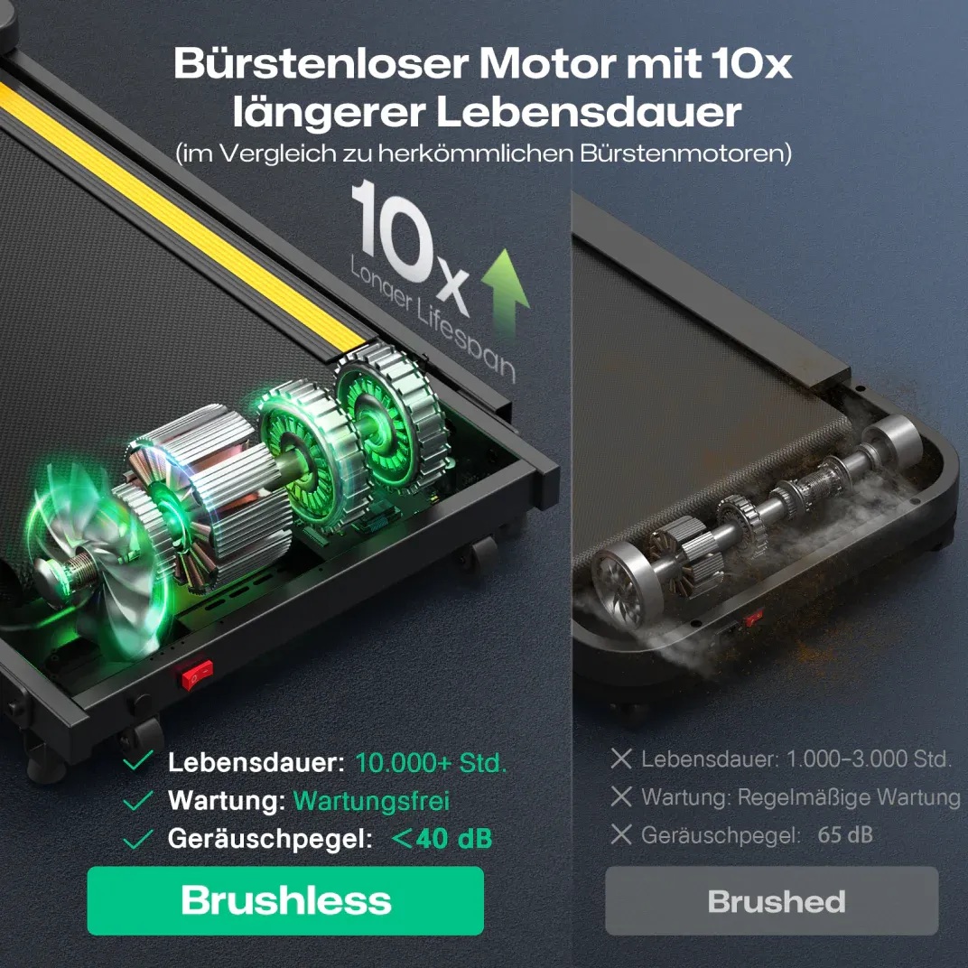 Ausgestattet mit einem 2.5 HP starken bürstenlosen Motor arbeitet das Laufband besonders stabil, leise und langlebig. Die Konstruktion ermöglicht eine gleichmässige Leistungsentfaltung bei gleichzeitig reduzierter Geräuschentwicklung, wodurch sich das Gerät ideal für den Einsatz in Wohnumgebungen eignet. Die maximale Geschwindigkeit von 10 km/h sowie eine Mindestgeschwindigkeit von 1 km/h erlauben eine flexible Anpassung an unterschiedliche Trainingsintensitäten.