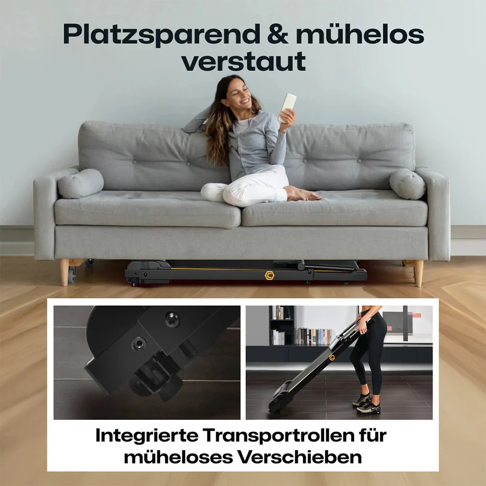 Dank des einfachen Faltmechanismus lässt sich das Laufband in nur einem Schritt auf eine kompakte Grösse von 122 x 66 x 14 cm zusammenklappen. Es wiegt lediglich 22.5 kg und passt mühelos unter Betten oder Sofas, sodass es minimalen Platz beansprucht und sich ideal für kleine Wohnräume eignet.