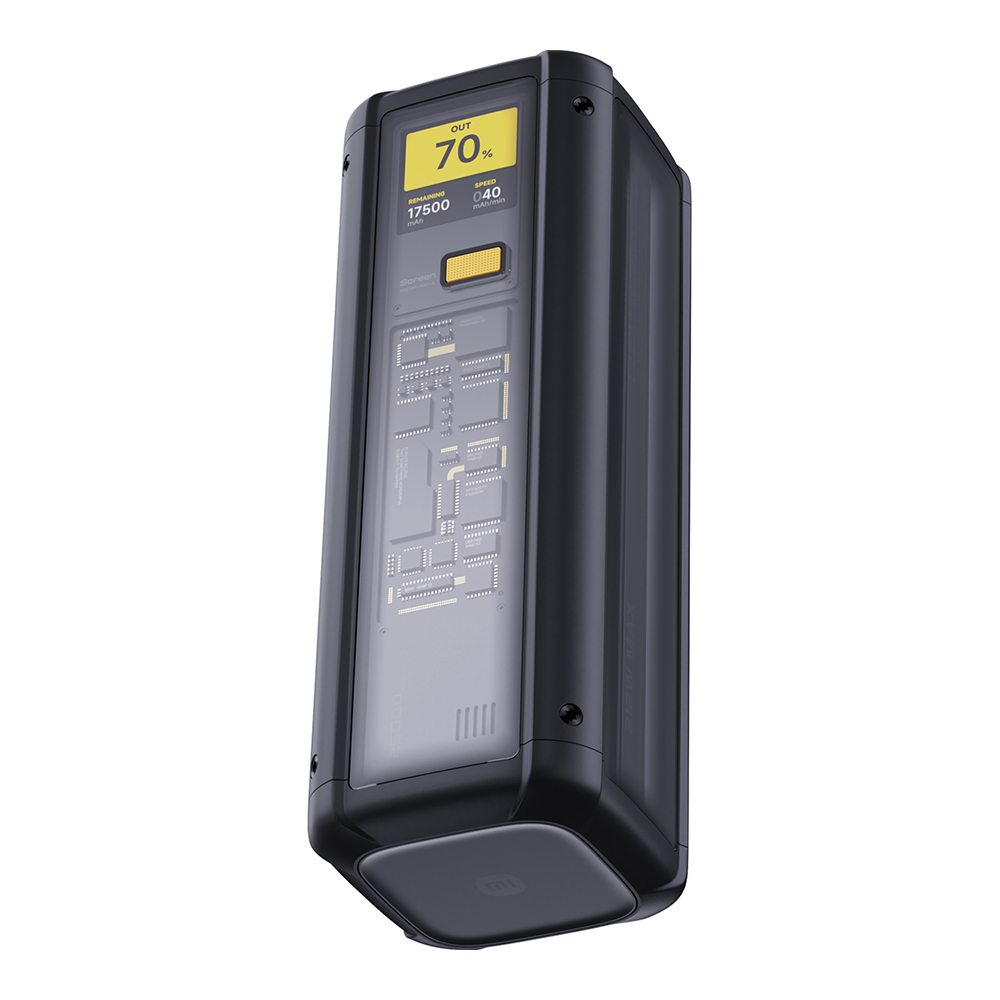 Das markante, dreiseitig transparente Gehäuse offenbart ein Geek-Chic-Interieur, das die technische Finesse des Geräts unterstreicht. Die robuste, kantige und zugleich glatt abgerundete Shell sorgt für eine komfortable Handhabung und einen starken optischen Eindruck. Ein integriertes Farbdisplay zeigt übersichtlich wichtige Informationen wie den Restakku und die aktuelle Ladegeschwindigkeit an, wodurch eine intuitive Nutzung und Kontrolle gewährleistet ist.