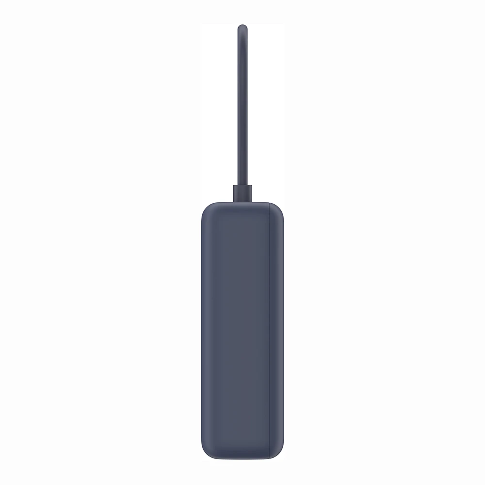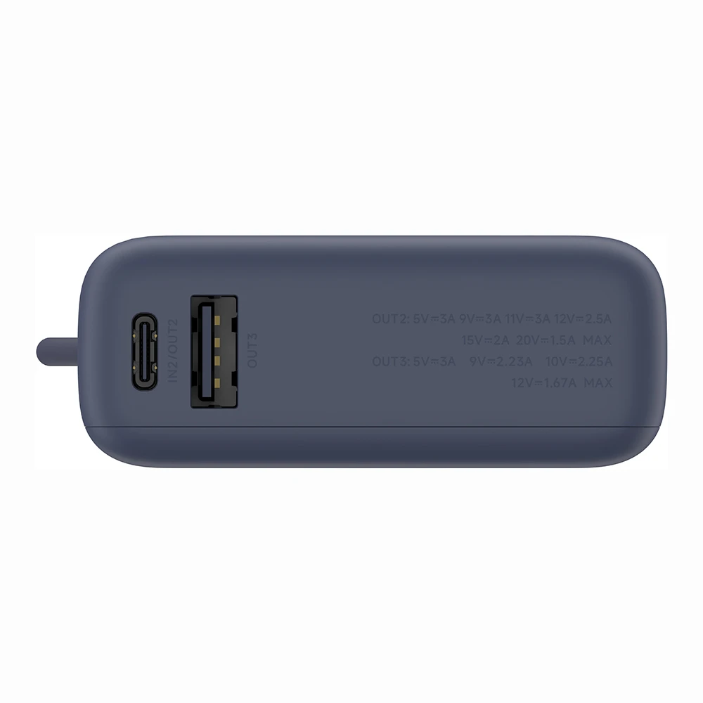 Die Power Bank bietet drei Ausgänge: ein USB-C-Anschluss, ein integriertes USB-C-Kabel und ein USB-A-Anschluss. Diese ermöglichen das gleichzeitige Laden von bis zu drei Geräten, ohne Kompromisse bei der Leistung einzugehen. Das integrierte Kabel sorgt für zusätzlichen Komfort und macht zusätzliche Kabel überflüssig.