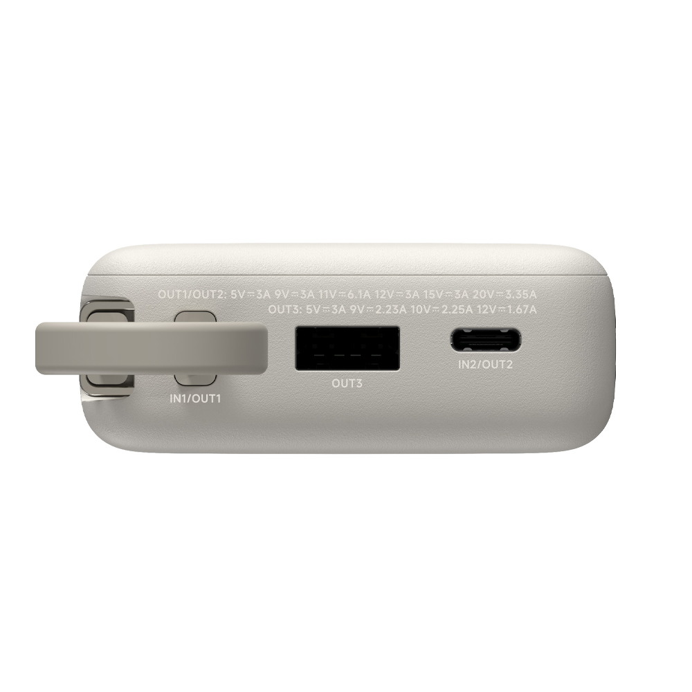 Ein fest integriertes USB-C-Kabel sorgt für zusätzliche Alltagstauglichkeit und reduziert den Bedarf an separatem Zubehör. Ergänzend stehen ein USB-C-Port sowie ein USB-A-Anschluss zur Verfügung, wodurch bis zu drei Geräte gleichzeitig geladen werden können. Diese Anschlussvielfalt erlaubt flexible Einsatzmöglichkeiten in unterschiedlichen Nutzungsszenarien.