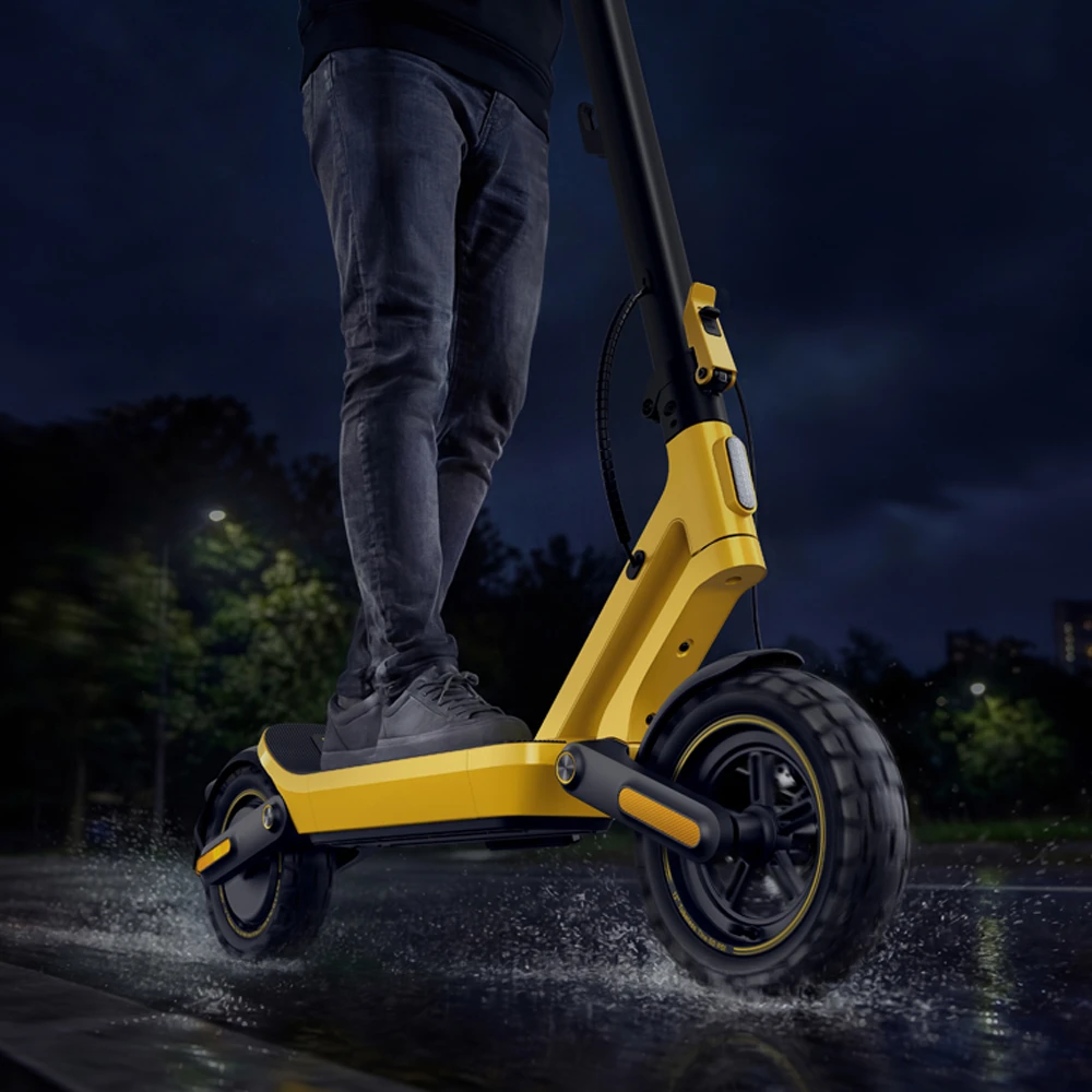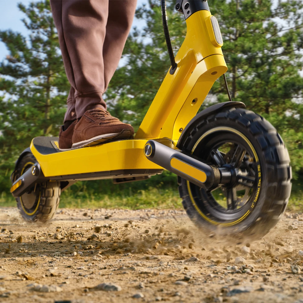 Ein 3-Zoll-TFT-Display liefert alle relevanten Informationen übersichtlich auf einen Blick. Die Bedienung erfolgt über eine Kombination aus Daumen- und Drehgas sowie eine multifunktionale Steuereinheit. Mit einer Standfläche von 195 Millimetern bietet der Scooter ausreichend Platz für einen sicheren Stand. Der Klappmechanismus erlaubt ein Zusammenfalten innerhalb weniger Sekunden und erleichtert Transport und Verstauung. Der integrierte Akku mit 585 Wh unterstützt zudem eine Schnellladefunktion, die mit einem separat erhältlichen Schnellladegerät genutzt werden kann.