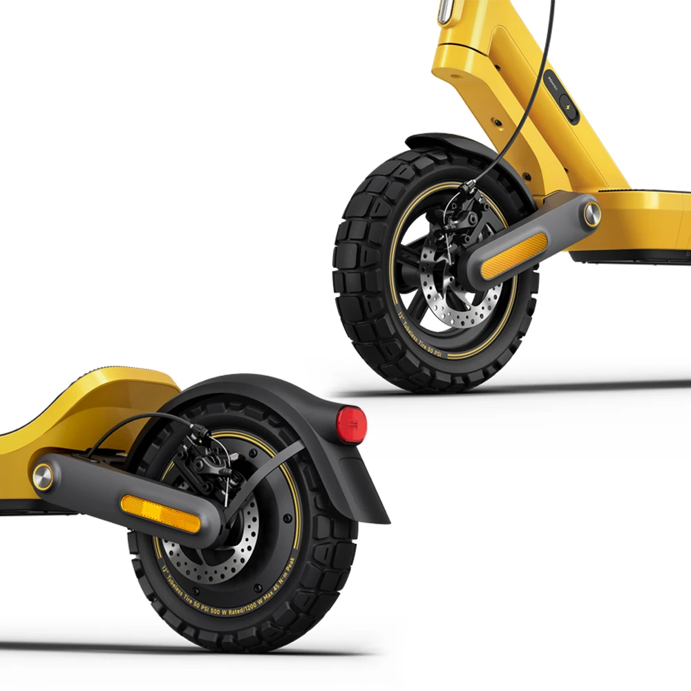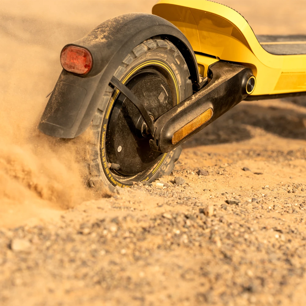 Für ein kontrolliertes und komfortables Fahrverhalten ist der Xiaomi E-Scooter 6 Ultra mit grosszügigen 12-Zoll-Tubeless-All-Terrain-Reifen ausgestattet. Diese bieten zuverlässigen Grip und eine hohe Laufruhe auf unterschiedlichsten Untergründen. Ergänzt wird das Setup durch eine Federung an Vorder- und Hinterachse sowie eine Bodenfreiheit von 150 Millimetern, wodurch Unebenheiten effektiv ausgeglichen und auch komplexe Strassenverhältnisse sicher gemeistert werden.