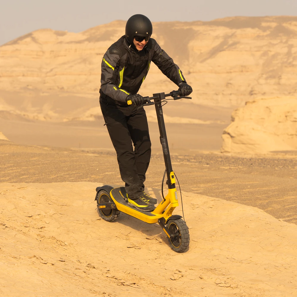 Das Bremssystem kombiniert Scheibenbremsen an Vorder- und Hinterrad mit einem elektronischen EABS-System, das für kurze Bremswege und hohe Fahrstabilität sorgt. Der Scooter erfüllt die Anforderungen der Norm EN17128 und ist nach IPX6 gegen starkes Spritzwasser geschützt. Diese Eigenschaften gewährleisten ein hohes Mass an Sicherheit und Zuverlässigkeit, auch bei wechselnden Wetterbedingungen.