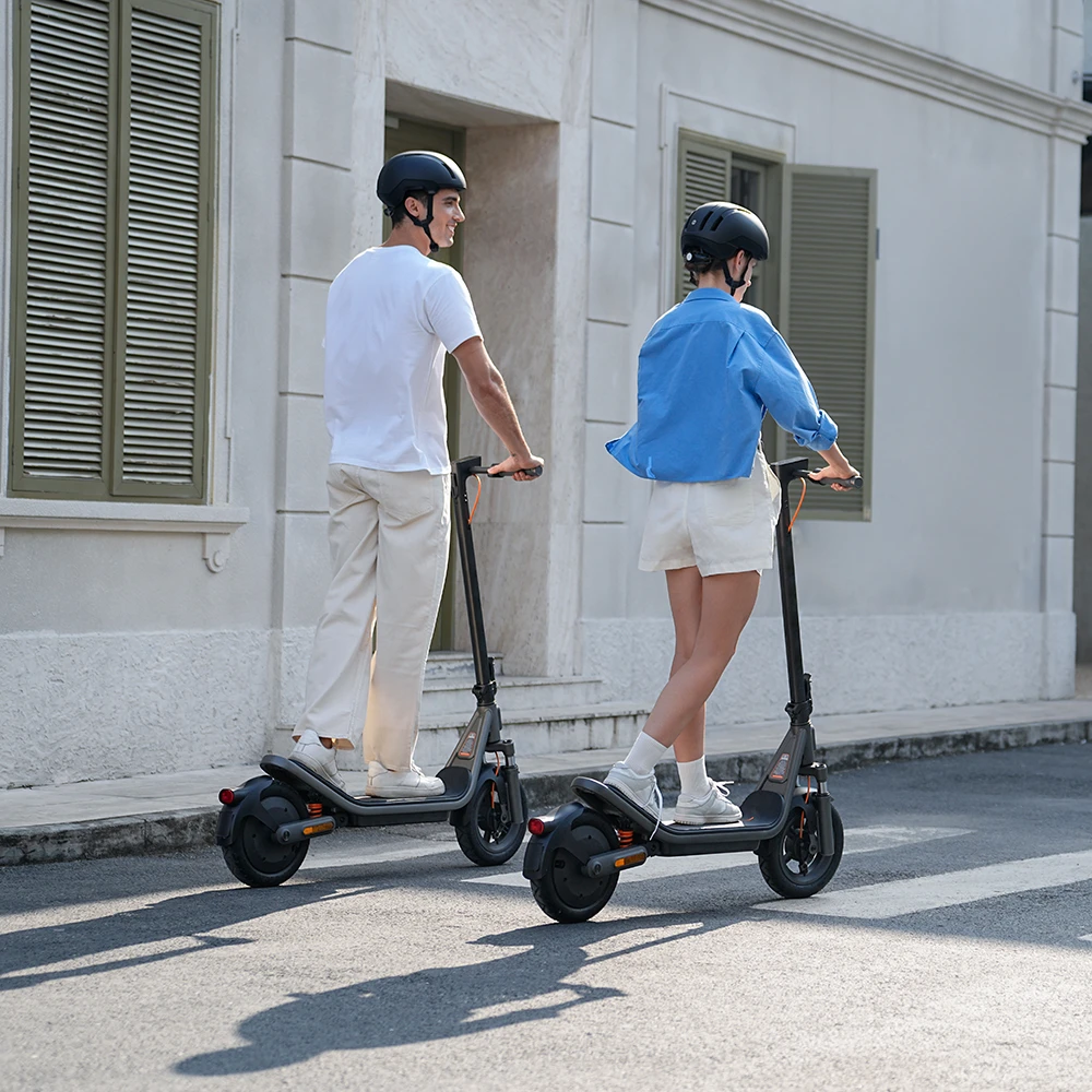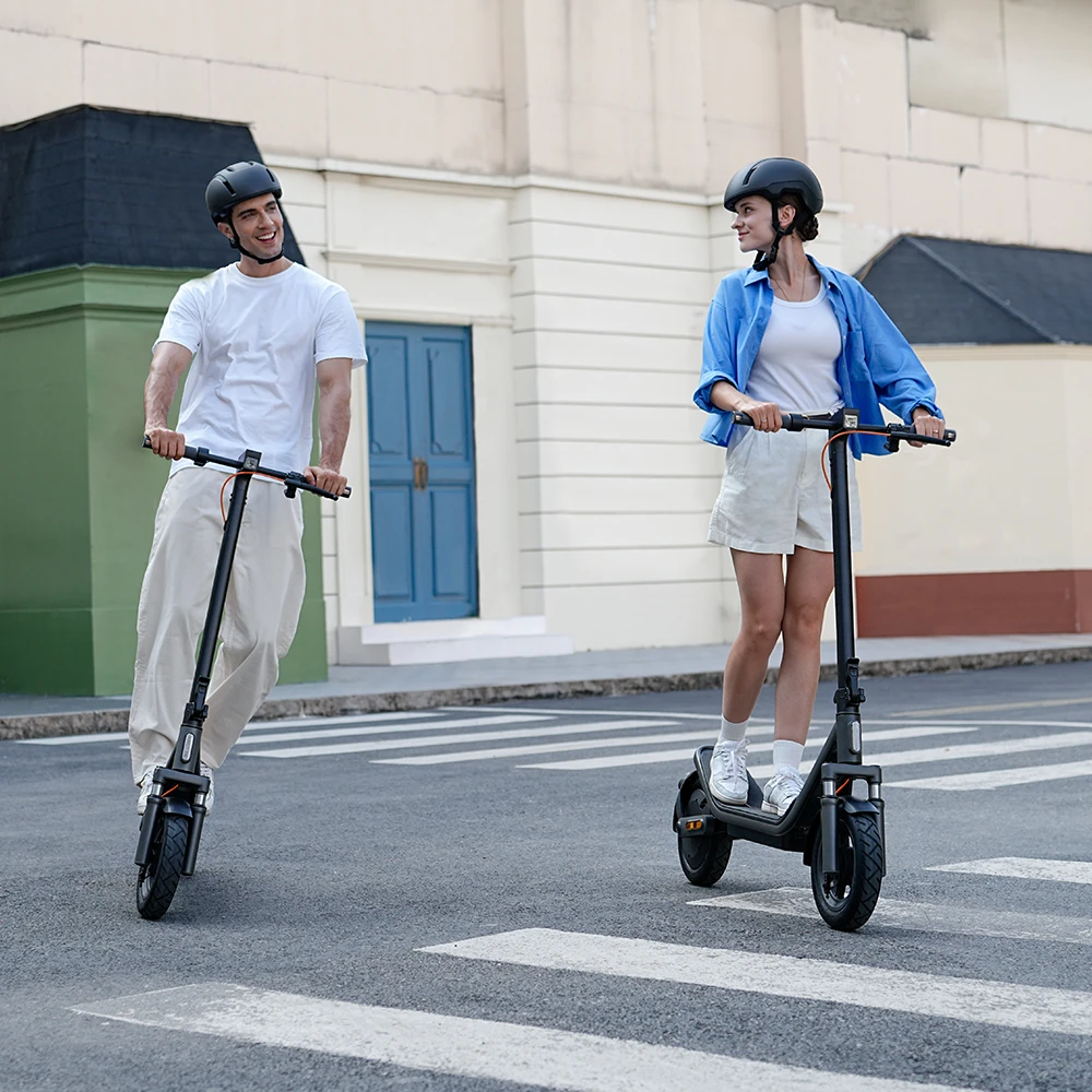 Für ein hohes Mass an Sicherheit sorgt das duale Bremssystem mit einer Trommelbremse an der Vorderachse und einer elektronischen E-ABS-Bremse am Hinterrad. Diese Kombination ermöglicht kontrollierte Bremsmanöver auch bei höherem Tempo und verbessert die Fahrstabilität bei plötzlichen Verzögerungen. Ergänzt wird das Sicherheitskonzept durch die IPX5-Zertifizierung, welche den gesamten Scooter gegen Spritzwasser schützt.