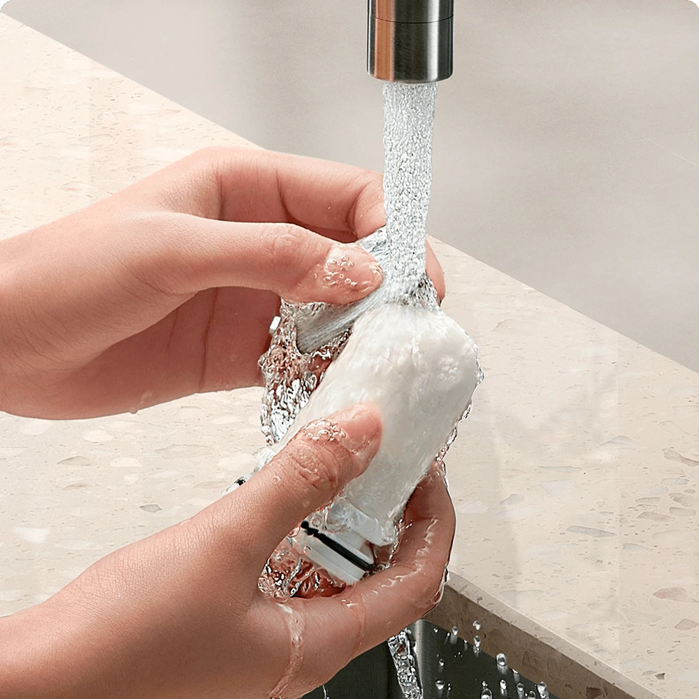Der Wasserhahnfilter zeichnet sich durch langlebige Komponenten aus. Der keramische Filter kann mehrfach gereinigt und mit einfachem Zubehör wie Sandpapier oder einem Scheuerschwamm gepflegt werden, wodurch seine Lebensdauer verlängert und Wartungskosten reduziert werden. Im Lieferumfang sind vier Filterkartuschen enthalten, deren Einsatzzeit abhängig von Wasserqualität und Verbrauch zwischen drei und sechs Monaten liegt.