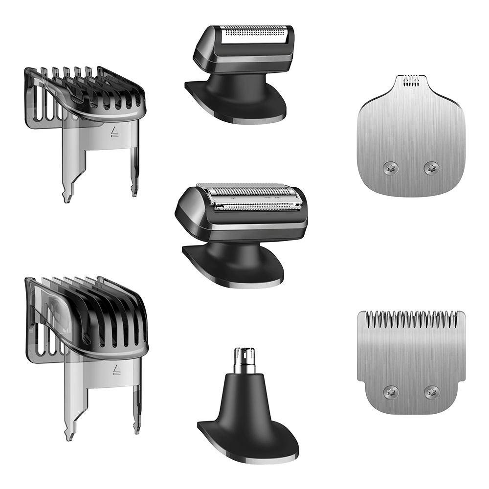 | Lieferumfang: | 1x Trimmer, 1x Scherkopf, 1x Rasierklinge für den Körper, 1x Präzisionsklinge, 1x Klinge für Nasen- und Ohrenhaare, 1x 0.5-10 mm Bartkammaufsatz, 1x 10.5-20 mm Bartkammaufsatz, 1x Reinigungsbürste, 1x Netzteil, 1x Ladekabel, 1x Aufbewahrungskoffer, 1x Aufbewahrungstasche, 1x Benutzerhandbuch, 1x Kurzanleitung |