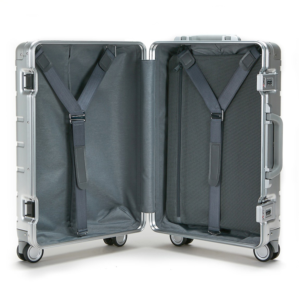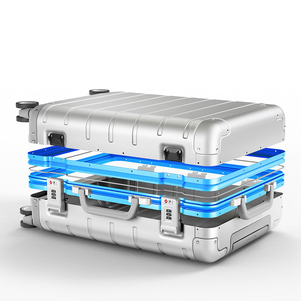 Für höchste Festigkeit und Elastizität kommt im Korpus eine 5er-Serie Aluminium-Magnesium-Legierung zum Einsatz, die gemeinsam mit einem führenden Luftfahrtunternehmen entwickelt wurde. Der Rahmen des Koffers besteht aus einer verstärkten 6er-Serie derselben Legierung und ist mit einer verdickten Rahmenkonstruktion ausgestattet, die äusseren Druck effektiv abwehrt. An den Kanten sorgen breite, verstärkte Profile sowie vier abstützende Auflagepunkte dafür, dass der Koffer auch bei hoher Belastung seine Form beibehält.