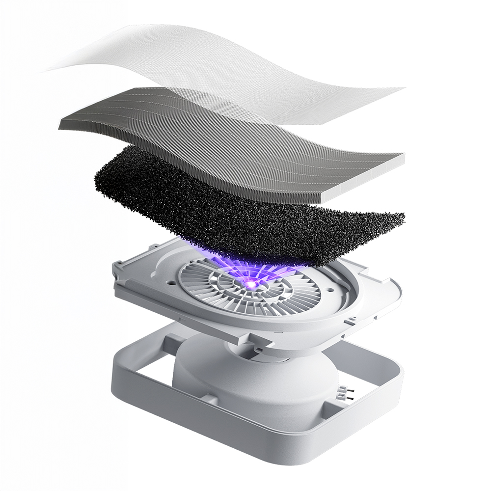 Im Zentrum des Gerätes steht ein verbessertes, fünfsensorielles System, das kontinuierlich relevante Parameter der Raumluft analysiert, darunter ultrafeine Partikel (PM1), Staub, PM2.5, Temperatur und Luftfeuchtigkeit. Diese Sensoren liefern in Echtzeit Daten über die Luftbedingungen, die sowohl am Gerät selbst über ein LED-Farbdisplay visualisiert als auch über die App steuerbar sind. Ergänzend kommt ein mehrstufiges Verbundreinigungssystem zum Einsatz, das aus einem Primärfilter, einem hocheffizienten Filter sowie einer Aktivkohleschicht besteht und damit Partikel, allergene Stoffe, chemische Gerüche und flüchtige organische Verbindungen wirkungsvoll reduziert.