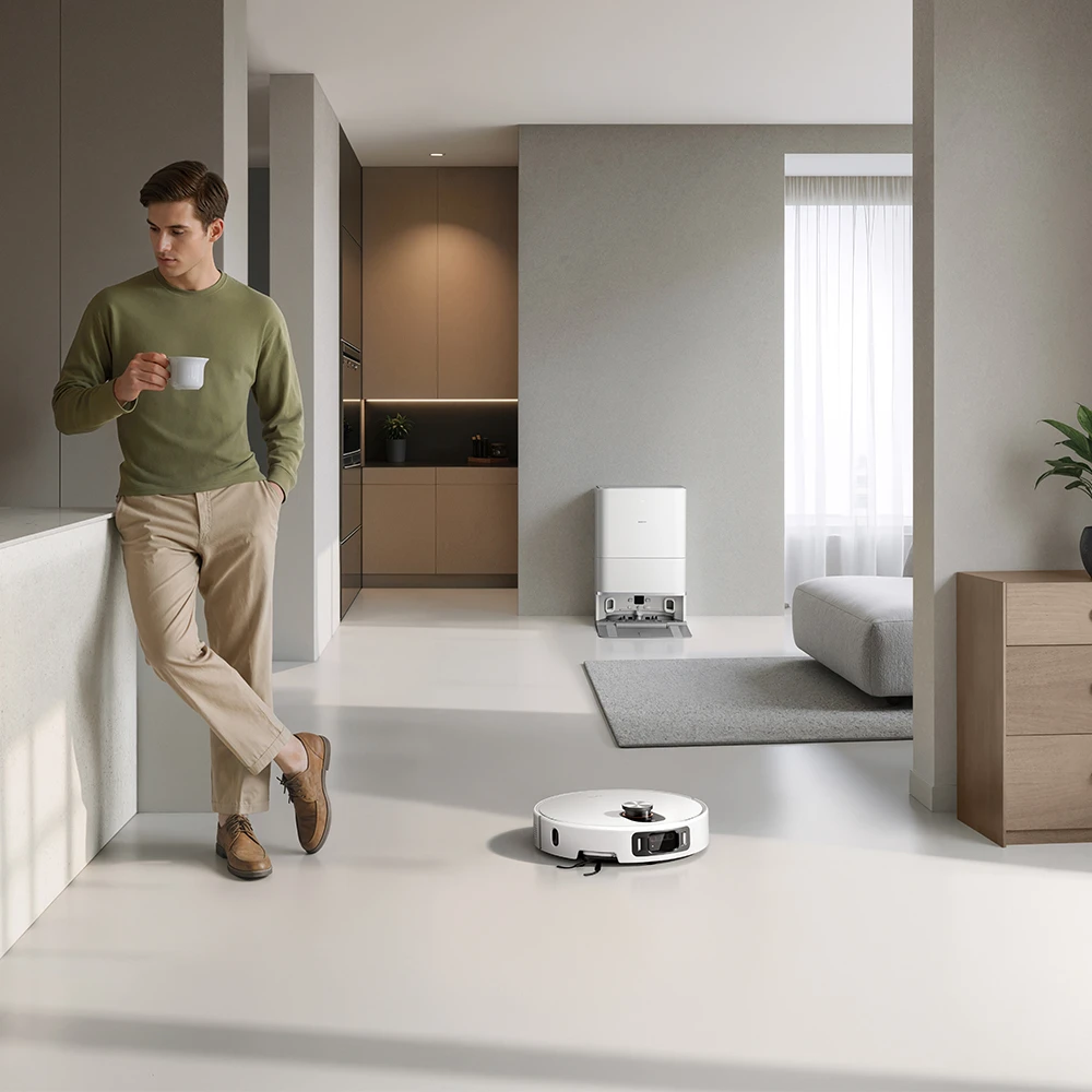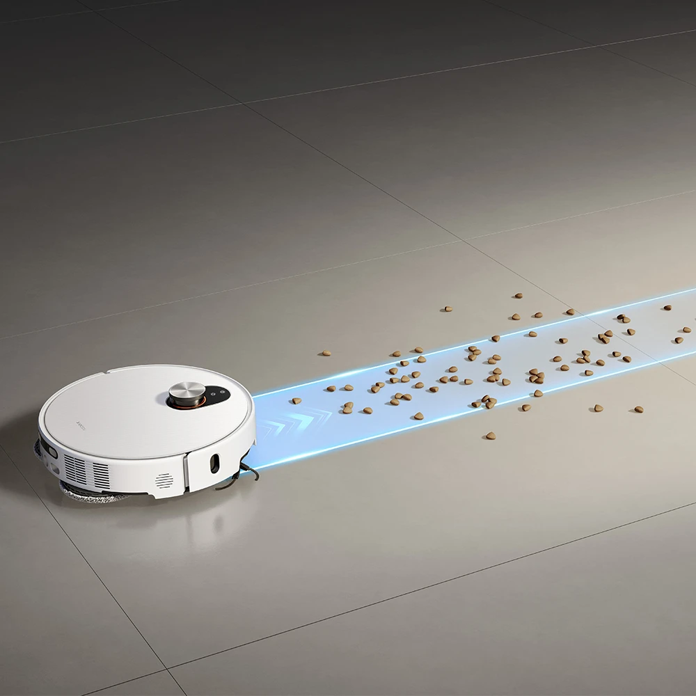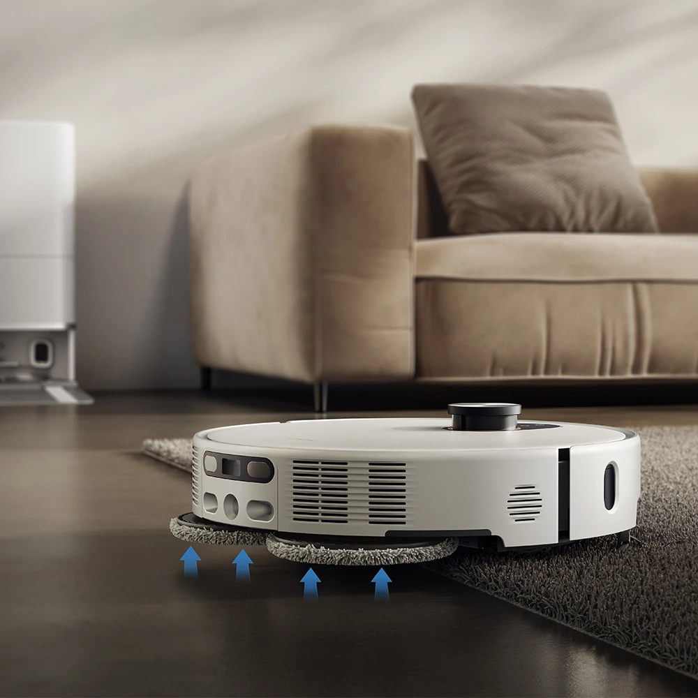 Ein zentrales Merkmal ist das dToF Smart Retractable Radar, das sich automatisch absenkt, sobald der Roboter in niedrige Bereiche gelangt. Dadurch kann er selbst unter Möbelstücke mit nur 9.5 cm Höhe vordringen. Die Reinigung von Kanten und Ecken erfolgt über eine doppelt ausfahrbare Wischfläche und eine ausfahrbare Seitenbürste. Diese erreichen eine Reinigungsdistanz bis auf 0 mm zur Wand, wodurch selbst Raumbegrenzungen ohne sichtbare Staubreste behandelt werden können.