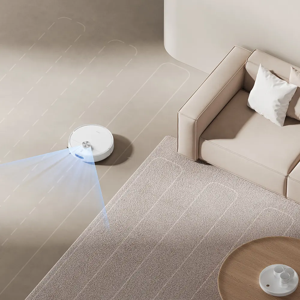 Die integrierte LDS-Laser-Navigation scannt den Raum in 360 Grad und erstellt binnen kürzester Zeit exakte 3‑D‑Karten mehrerer Etagen. Automatisch geplante Routen minimieren Doppelreinigungen und verpasste Stellen, während Sensoren Stufen erkennen, Hindernisse zuverlässig umfahren und Türschwellen bis zu 20 mm Höhe überwinden.